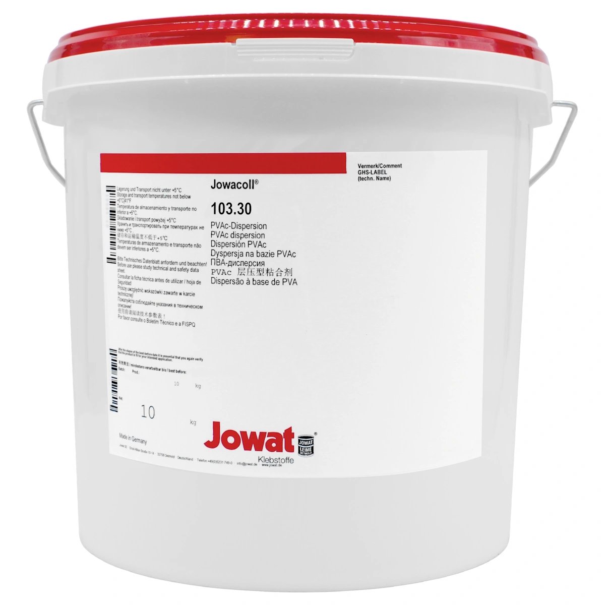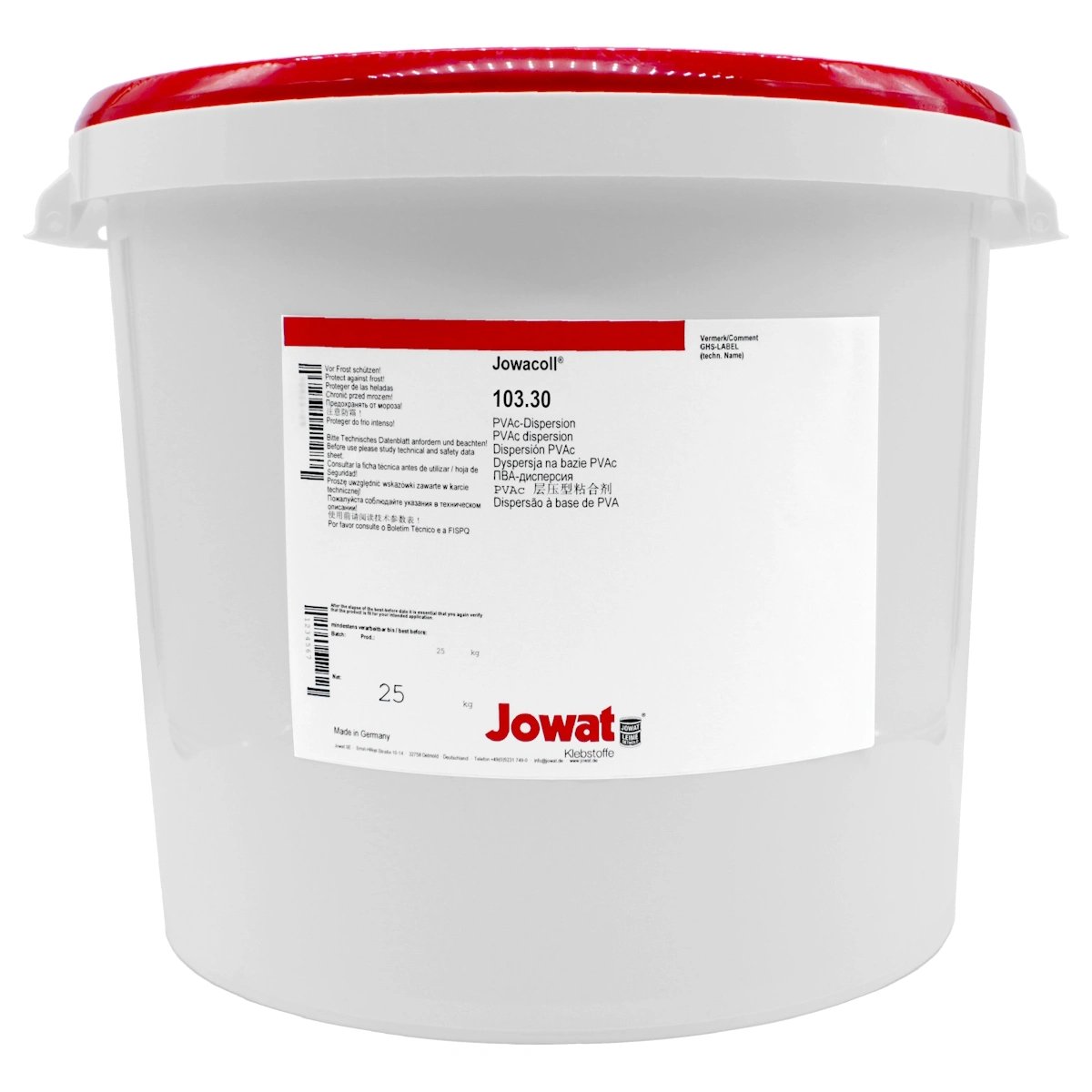 pH-neutraler D3-Holzleim für feuchtebeständige Verleimungen – universell einsetzbar, ohne Holzverfärbungen. Der Jowacoll® 103.70 ist ein hochwertiger, pH-neutraler Dispersionsklebstoff auf PVAc-Basis. Er eignet sich für vielfältige Anwendungen im Holzbereich und überzeugt durch feuchtebeständige Klebungen ohne das Risiko holzbedingter Verfärbungen. Produkteigenschaften pH-neutral: Reduziert das Risiko von Holzverfärbungen, insbesondere bei empfindlichen HölzernSehr anwenderfreundlich: Leicht aufzutragen, gute VerarbeitbarkeitUniversell einsetzbar: Für eine Vielzahl von Holz- und Holzwerkstoffen geeignetFeuchtebeständig: Entspricht bei sachgemäßer Anwendung der Beanspruchungsgruppe D3 nach DIN EN 204/205 (geprüft durch ift Rosenheim)Formaldehydfrei: Ohne gesundheitsschädliche Emissionen Anwendungsbereiche Dieser D3-Holzleim ist ideal für alle Verleimungen, bei denen eine erhöhte Feuchtebeständigkeit erforderlich ist. Dazu zählen beispielsweise: Türen und FensterMöbel für FeuchträumeVerleimungen von Hart- und WeichholzSpanplatten und andere HolzwerkstoffeFlächenfurnierung und VlieskaschierungHerstellung von Parkett- und Starkfurnieren Verarbeitungshinweise Verarbeiten Sie den Klebstoff mit üblichen Auftragssystemen wie Walze, Pinsel, Spachtel oder Rolle.Nach der Aushärtung wird der Leim transparent.Verwenden Sie für alle materialführenden Teile Werkstoffe aus V2A-Edelstahl (gemäß DIN EN 10027, W-Nr. 1.4301 oder höherwertig) oder indifferente Kunststoffe (z. B. Teflon, Polyamid, PP).Vermeiden Sie unbedingt den Kontakt mit Metallen wie Zink, Kupfer, Aluminium oder Messing, da diese Reaktionen mit Holzinhaltsstoffen (z. B. Gerbsäure) auslösen können. Hinweis: Je nach Holzart, Herkunft, Einschnitt oder Vorbehandlung kann es trotz pH-neutralem Leim zu zeitverzögerten Verfärbungen kommen. Eine typische Reaktion ist z. B. die Eisen-/Gerbsäureverfärbung. Reinigung Reinigen Sie Ihre Geräte und Maschinen unmittelbar nach der Verwendung mit kaltem oder warmem Wasser – idealerweise unter Zugabe des Jowat® 192.40 Klebstoff-Entferners. Lagerung Lagern Sie das Produkt in gut verschlossenen Originalgebinden bei trockenen, kühlen Temperaturen zwischen 15 °C und 25 °C.Temperaturen unter +10 °C sind zu vermeiden, da sie die Viskosität stark verändern und die Klebeeigenschaften negativ beeinflussen können. Vor Frost schützen! Das Mindesthaltbarkeitsdatum entnehmen Sie bitte dem jeweiligen Gebindeetikett.